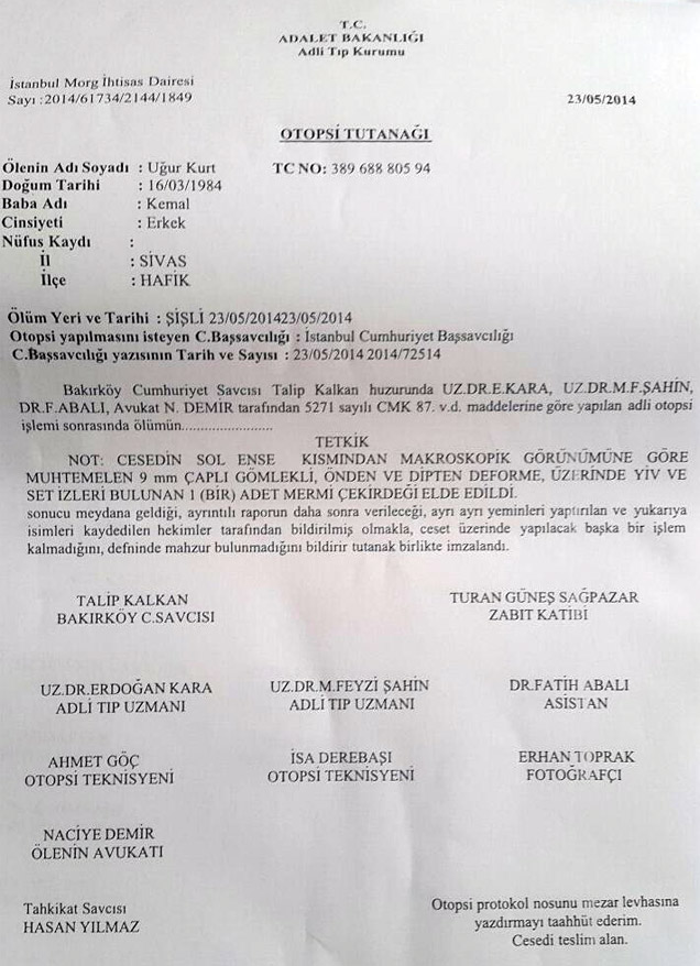 13:00 Okmeydanı Cemevi’nde polis saldırısı sırasında açılan ateş sonucu hayatını kaybeden 30 yaşındaki Uğur Kurt‘un otopsi raporu ortaya çıktı. İstanbul Cumhuriyet Başsavcılığı’na sunulan raporda ölümün mermiden kaynaklandığı belirtildi. Raporda “Cesedin sol ense kısmından makroskopik görünümüne göre muhtemelen 9 mm çaplı gömlekli, önden ve dipten deforme, üzerinde yiv ve set izleri bulunan bir adet mermi çekirdeği elde edildi.” denildi.