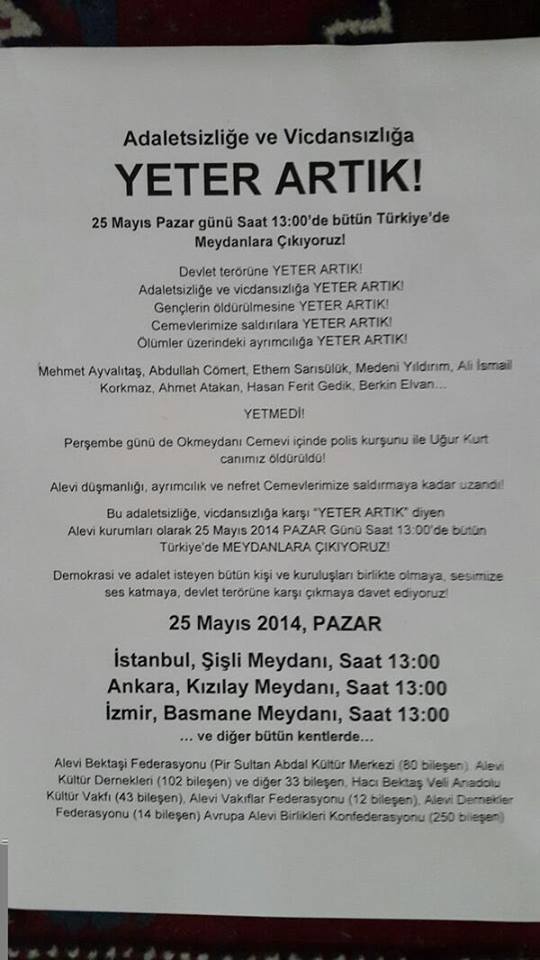 15.44 Aleviler, 25 Mayıs pazar günü 13.00′da ‘Adaletsizliğe ve vicdansızlığa yeter’ sloganıyla meydanlara çıkıyor.